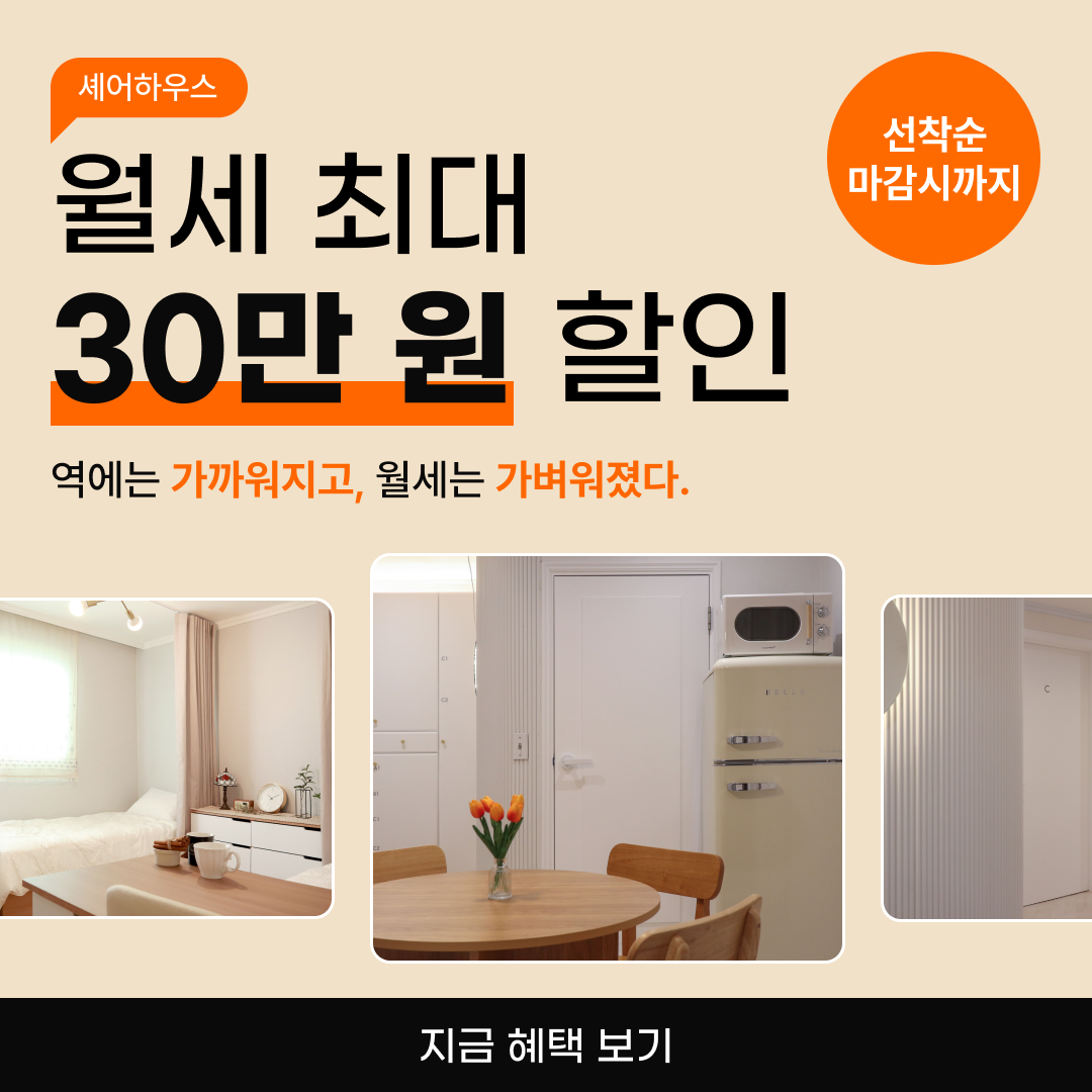 지금, 초역세권 쉐어하우스 월세 최대 30만 원 할인 프로모션 진행 중!
